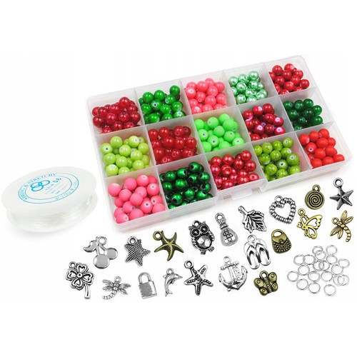 Zestaw do robienia bransoletek z koralików szklanych czerwono-zielony 10 zawieszek...